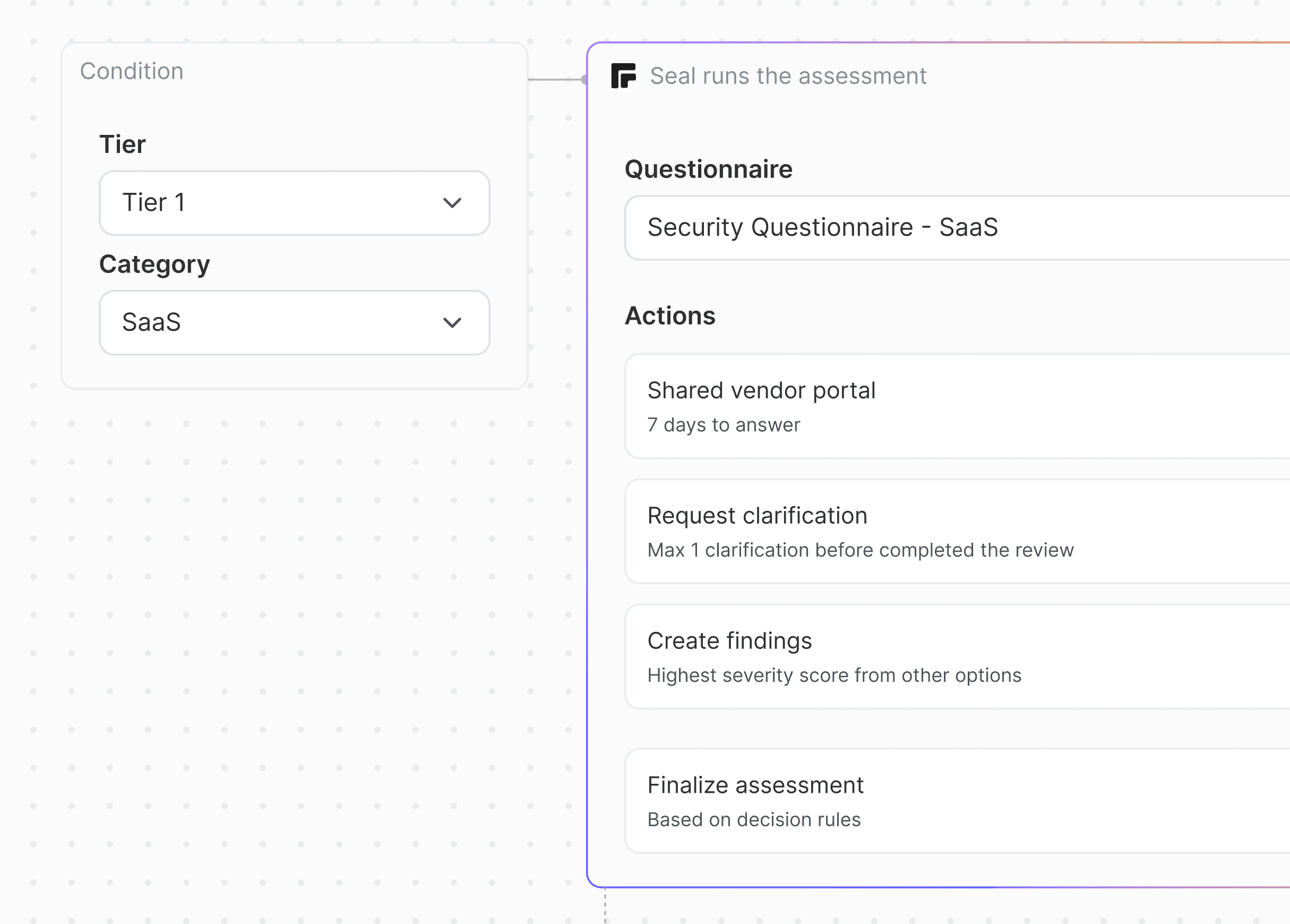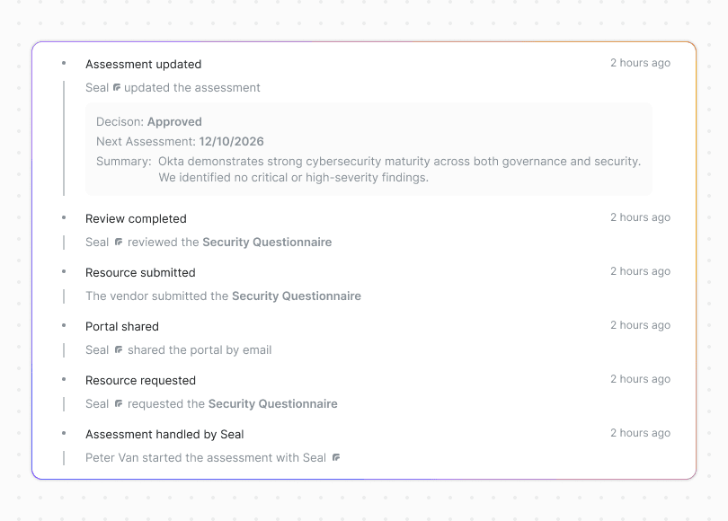 Seal prend 100% de la charge de vos questionnaires de sécurité pour évaluer vos fournisseurs. Vous définissez les règles. Seal les applique sous votre contrôle
